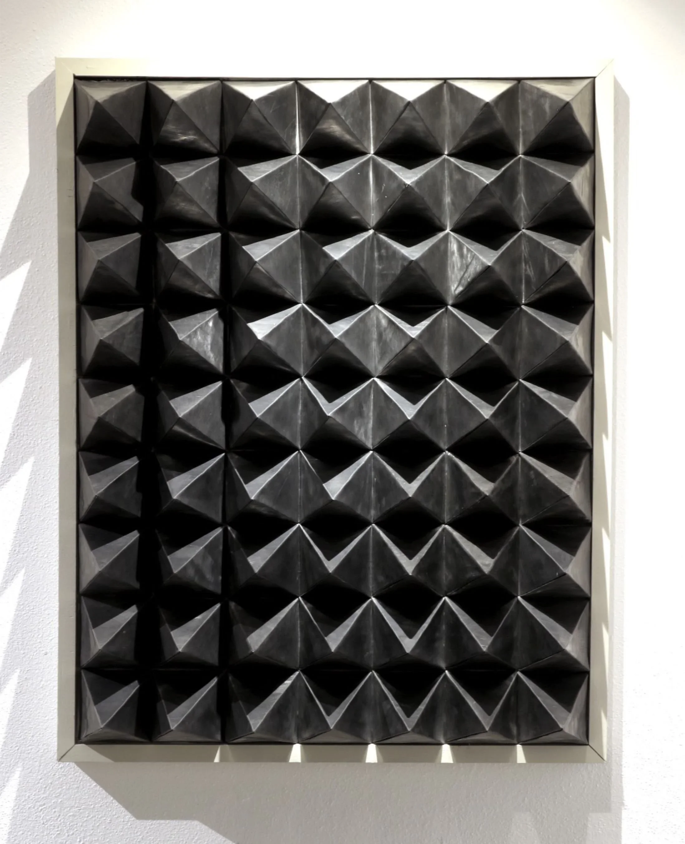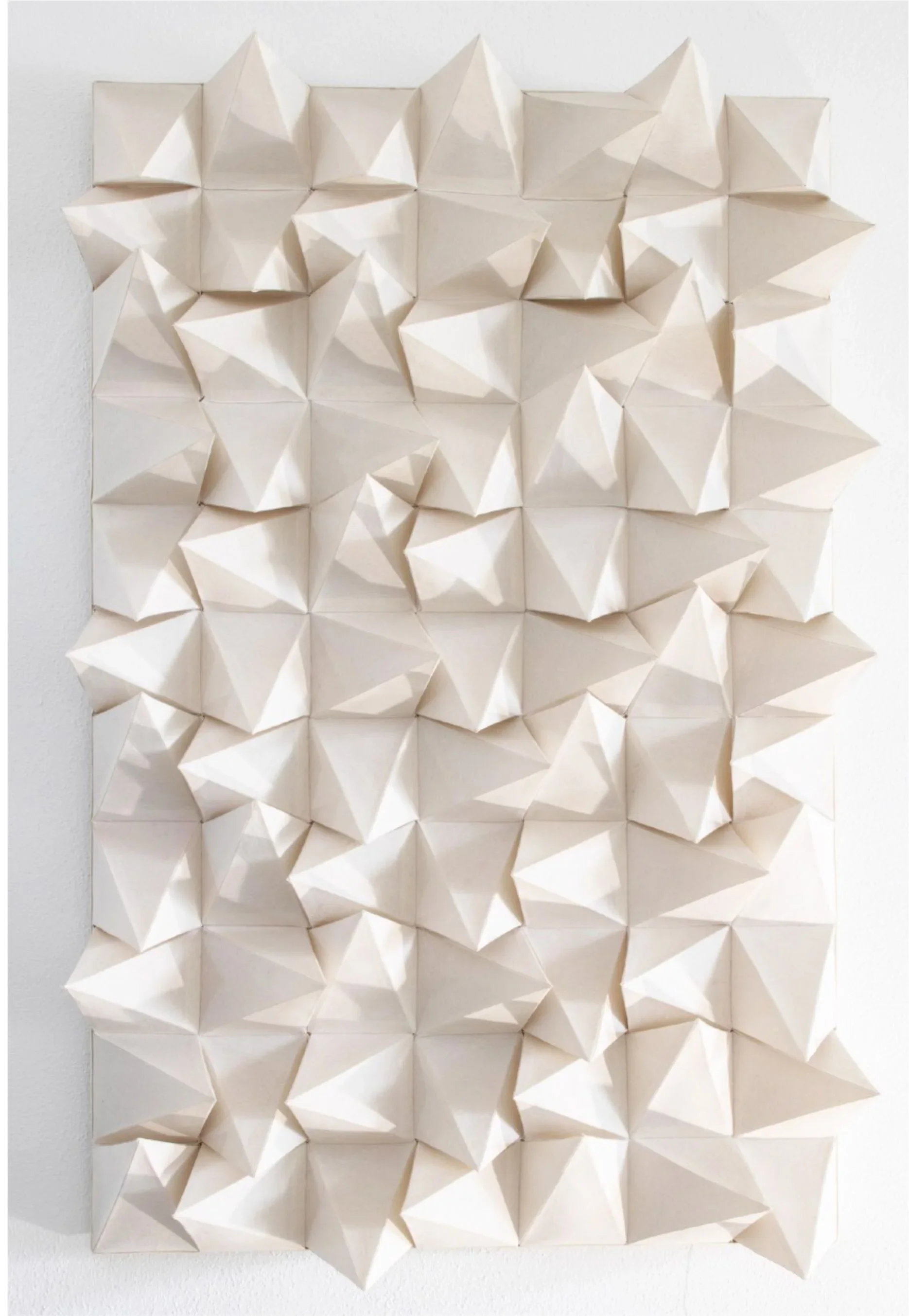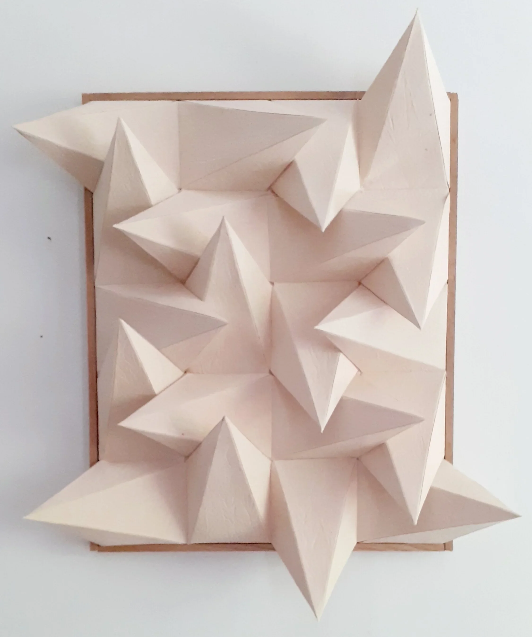 The pyramid form is introduced as a structural response to this logic of defense. Historically a symbol of power, permanence, and sacred protection, the pyramid here is reimagined as a modular, reactive object. It channels energy upward, but also down into the ground, both anchor and antenna. Each sculptural pyramid is layered, textured, and assembled to mimic both the micro-armor of the parasite and the logic of textile folding: rigid yet flexible, protective yet breathable.